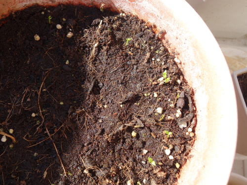 大きい鉢にも同様に「花と野菜のかる〜い培養土」を入れて50個を正方形の四隅と中心の5箇所に10個ずつ蒔きました。