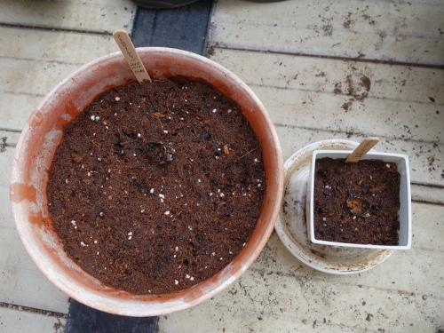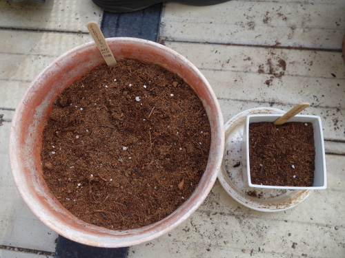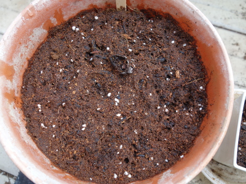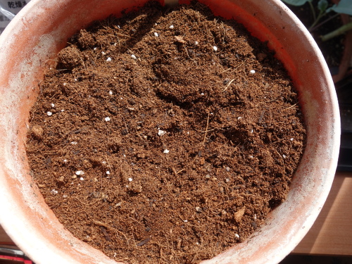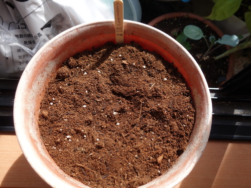 小さい鉢にDCMブランドの「花と野菜のかる〜い培養土」を入れて13個を蒔きました。