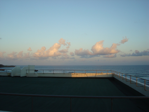 ANAインターコンチネンタル万座ビーチリゾートのプライベートビーチやプールは早朝は日蔭になっています。それは基本的にホテルが西の方向に向いて作ってあるからでしょう。ブセナテラスでも同様です。つまり、リゾートホテルでは朝日より夕日の方が重要視されているということでしょうか。実際に、お客さんがアクティブに動くのは早朝ではなく、昼〜夕方ですので、夕陽が見える部屋がいいですし、夕方に蔭になるプールやビーチはいやですね。