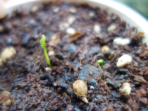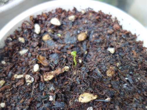 4月12日に発芽しているのに気付きました。奥の方にも1本発芽してまだ曲がっている1本もあります。4日前にノバ・オレンジの発芽に気付いた時には発芽していなかったので、この4日のうちに発芽しました。種を蒔いてから1ヶ月半で発芽したことになります。