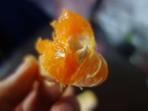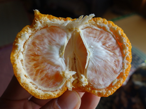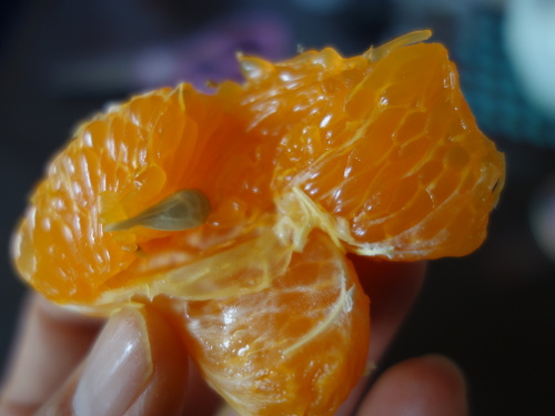 横から接写しました。津之望の味は個人的にはポンカンのようだと思いました。とてもおいしかったです。味がポンカン寄りならポンカン同様ノビレチンがたくさん入っているのではないかかと期待してしまいます(シークヮーサーやポンカンのような匂いがしないのであまり入っているようには思えませんが)。種から発芽したら育ててみようと思います。しばらく様子見です。