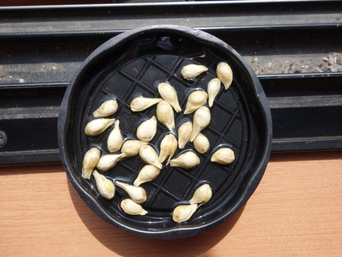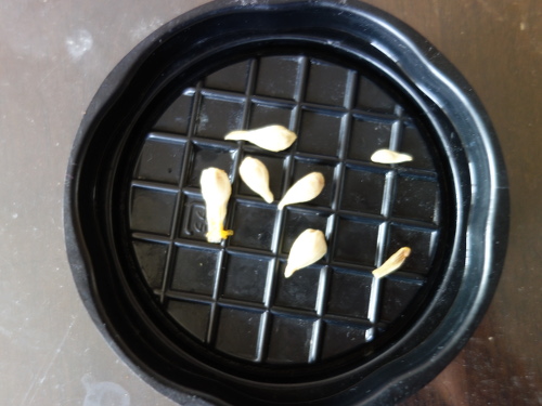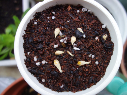 わりとちゃんとした種5個とたぶんだめな2個を一晩水に浸しておいて、朝に昨日の鉢に追加で載せました。