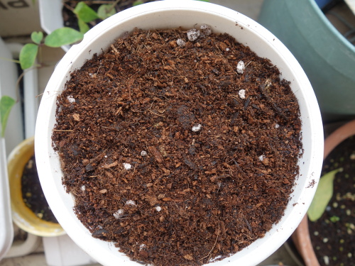 小さめの鉢に「野菜と花のかる〜い培養土」を入れましたました。