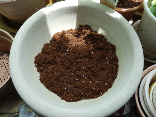 プランターに「花と野菜のかる〜い培養土」を入れました。