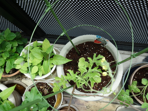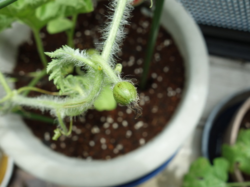 実は1株あたり2個か1個を残して栽培するとよく太った果実ができると説明書に書いてあります。ただ、それは畑に植えた場合であって、ベランダでプランターで栽培する場合は水切れを起こしやすかったり、根の広がりに限界があったりして、成長が制限されるので実の収穫は難しいことが予想されます。さらに真夏にはベランダの温度がかなり上がるので、熱でやられてしまいます。これらの難関をクリアーして大きい実が収穫できることを期待しています。希望がdriving forceになっています。やってみることが重要だと思っています。
