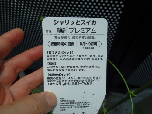 大玉スイカ縞紅プレミアムの苗に付いていたタグの裏の説明書き。