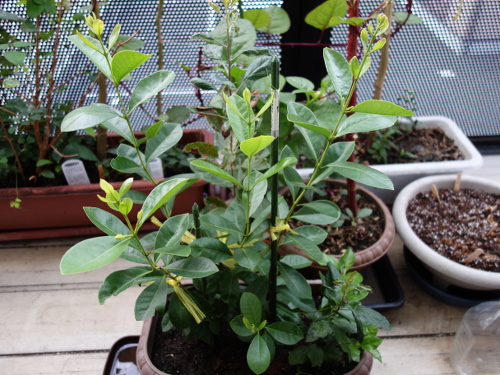 発芽して1年経ったNo.1の方は、幹の先端が枯れていますが、枝に蕾がついています。これで、2年目には花が咲くことの再現性がとれました。