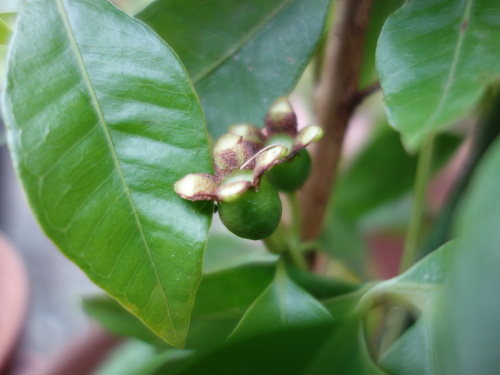 No.1の鉢の方の実。ピンポン玉大のものになりました。種を蒔いてから2年で実が採れました。よって、発芽させて育てる時は最速で2年サイクルという結果の再現性は確認できました。