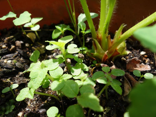 プラスチックの鉢にはツルムラサキ(緑茎種)を植えたので、1本生き残ったグァバの実生は陶器製の鉢に植え替えました。