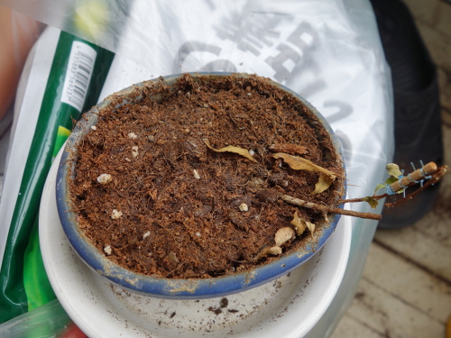 1本目と同条件で栽培していた2本目の挿し木は葉っぱは出て来ていません。No.1と比較するために鉢に植え替えて引き続き観察をしています。