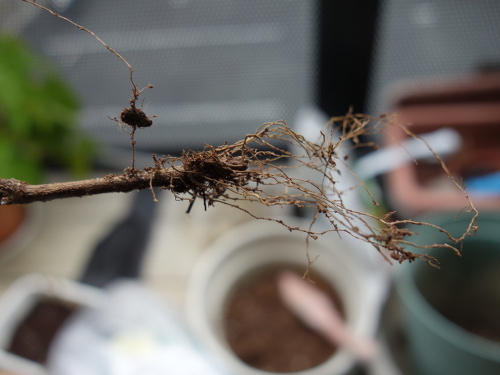 No.1は4月12日時点では掘り起こしてみたら根は見当たりませんでした。現在、このNo.1は挿し木栽培を継続しています。同時に始めたNo.2の挿し木は葉っぱは出てきていませんが、比較のために継続して経過を見ています。