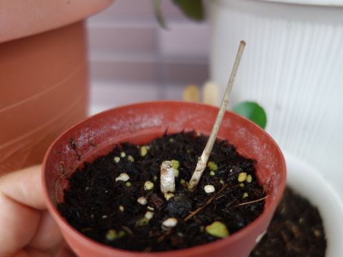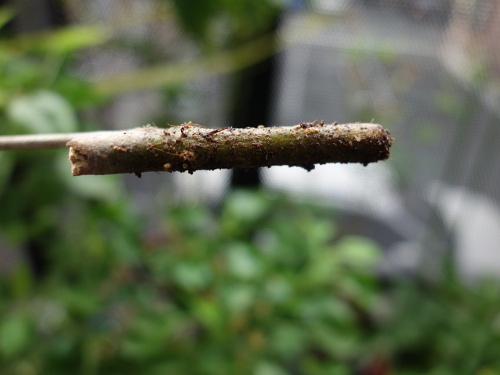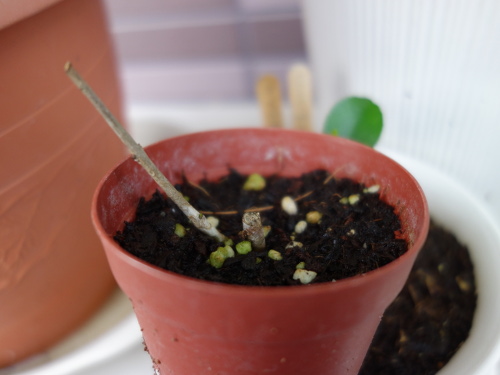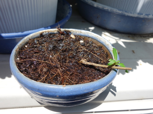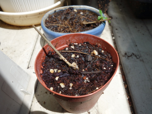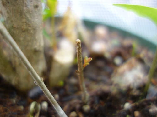 5月19日夕方現在、ダメかもしれないと思っていた挿し木No.2の方に、小さい芽が出ているのを発見。