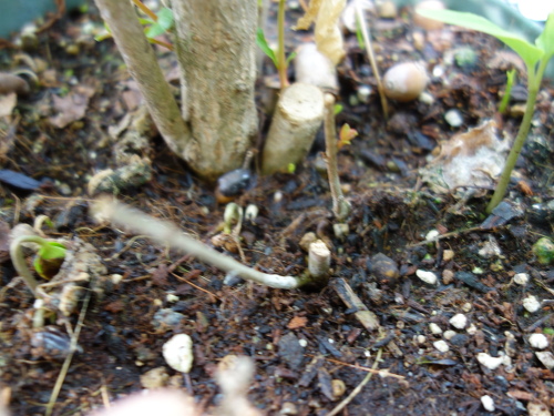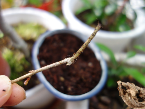 挿し木にしたもう1本のザクロの枝(写真左)は新芽は出ていません。ちょっとピンぼけしています。掘り起こしてみることにします。