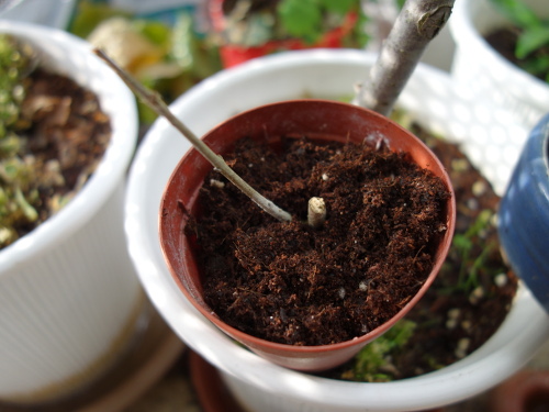 2017年11月から始めたザクロの鉢植え栽培の過程で枝を剪定した際に、切り落とした2本の枝を根元の土に挿し木として育てていました。すると、2018年4月12日現在、葉っぱが出てきていました。それを鉢に植え替えて挿し木栽培を継続します。
